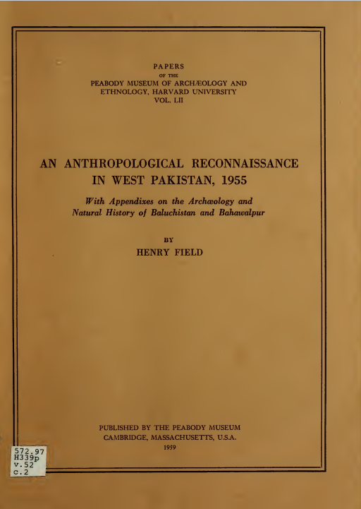 An Anthropological Reconnaissance in West Pakistan 1955 with appendixes on the archaeology and natural history of Baluchistan and Bahawalpur by Henry Field