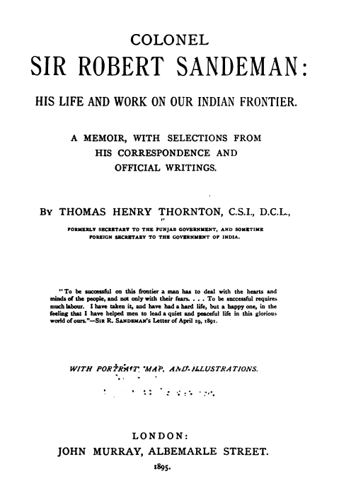 Colonel Sir Robert Sandeman: His Life and Work on our Indian Frontier A Memoir with selections from his Correspondence and Official Writings by Thomas Henry Thornton, C.S.I, D.C.L