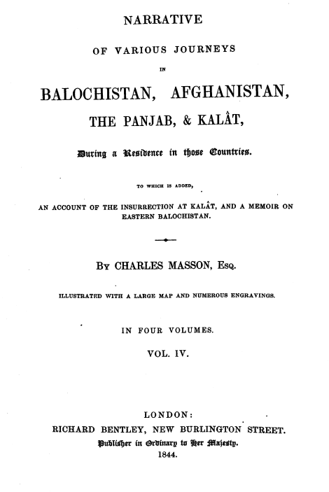 Narrative of various journeys in Balochistan, Afghanistan and the Panjab; including a residence in those countries; to which is added An Account of the insurrection at Kalat, and a Memoir on Eastern Balochistan Volume IV by Charles Masson, ESQ.